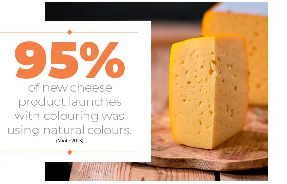 Cheese brands are focusing on range extensions to bring novelty to the category, which accounted for 37% of global cheese innovation in 2023 (Mintel, 2024). Brands looking to innovate can start with new colours, flavours, and formats, leveraging on consumers’ appetite for new cheese types. Developers tasked with updating a current product line-up may move to simplify ingredient statements with clean label colours, or they may look for more efficient solutions to achieve similar shades. In 2023, in the processed cheese European market, 30% of new launches were free from additives, highlighting the market progression towards cleaner labels (Mintel, 2024).